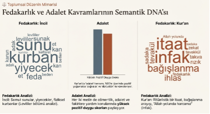Veri analizi sonuçları hem Kur'an hem de İncil'in cömertlik, adalet ve fakirlere yardım konularında son derece yüksek pozitif duygu skorları paylaştığını kanıtlamaktadır. Her iki kutsal metin (Kur'an, İncil), açgözlülüğü mahkum eden ve paylaşmayı yücelten benzer retorik yapılar üzerine kuruludur.