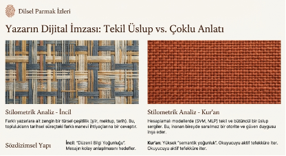 Hesaplamalı dilbilim verileri, İncil ve Kur'an'ın farklı stilistik stratejiler kullandığını kanıtlamaktadır: İncil'in eylem ve hareket odaklı anlatısı tarihsel bir derinlik sunarken; Kur'an'ın ritmik, yoğun ve sıkıştırılmış yapısı ilahi bir otoriteyi temsil eder. Bu stilistik imzalar, metinlerin sadece "ne" dediğini değil, bu mesajın insan ruhunda ve sosyal düzende "nasıl" bir etki bırakmak için tasarlandığını sayısal olarak doğrular.