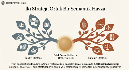 Matematiksel benzerlik motorları, İncil ve Kur'an arasında 0.33 kosinüs benzerliği saptamıştır. Bu skor, her iki metnin de aynı semantik köklerden beslendiğini ancak bu kökleri farklı stilistik dallarla işlediğini kanıtlamaktadır.