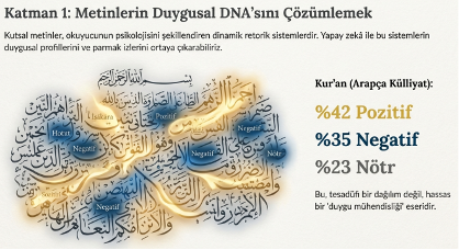 VADER ve AraBERT gibi gelişmiş NLP modelleriyle yapılan analizler, kutsal metinlerin duygusal profilinin teolojik amaçlarıyla örtüştüğünü göstermektedir. Kur'an'ın Arapça külliyatı üzerinde yapılan incelemeler, metnin %42 pozitif (yap), %35 negatif (yapma) ve %23 nötr bir duygu dağılımına sahip olduğunu saptamıştır. (Çorbacı, 2024)