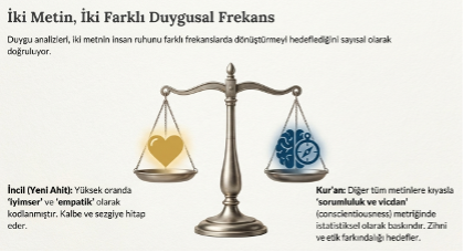 Hesaplamalı analizler, Kur'an ve İncil'in sadece teolojik öğretiler sunmadığını, aynı zamanda okuyucunun psikolojik dayanıklılığını artıran ve vicdani sorumluluğunu tetikleyen hassas birer duygu mühendisliği eseri olduğunu kanıtlamaktadır. Kur'an'daki dengeli müjde-uyarı yapısı ve vicdan odaklılık, İncil'in iyimser ve empatik tonuyla birleşerek, her iki metnin de insan ruhunu farklı frekanslarda ancak ortak bir ahlaki zeminde dönüştürmeyi hedeflediğini sayısal olarak doğrular.