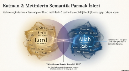 Hesaplamalı benzerlik motorları, İncil'deki "Rab" (Lord) ve Kur'an'daki "Allah" kavramlarının vektör uzayında birbirine en yakın "komşular" olduğunu doğrulamaktadır. (Çorbacı, 2024) (McDonald, 2014) Psikolojik açıdan bu durum, her iki metnin de Tanrı'nın insanla olan ilişkisini merkeze aldığını gösterir. (A D, Godbole, Kapparad, Bhattacharjee, & Shrutilipi, 2025)