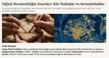 • Kritik Örnek: İncil'deki "Dağdaki Vaaz" üzerine yapılan analizlerde, modellerin bazı derin teolojik metaforları yanlışlıkla "mizah/şaka" (joking) olarak sınıflandırdığı görülmüştür. Bu durum, yapay zekanın dilin "yüzey anlamını" başarılı bir şekilde işlemesine rağmen, kutsal metinlerin ontolojik derinliğini ve metaforik katmanlarını tam olarak kavrayamadığını; bu nedenle analizlerde "alan uzmanı insan alim" denetiminin (human-in-the-loop) hayati olduğunu kanıtlar.