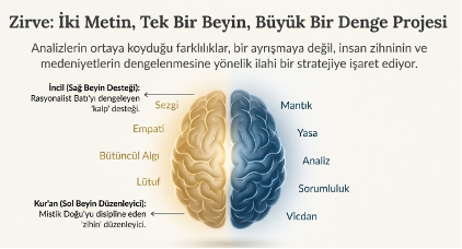Bu dengeleme projesi, kutsal metinlerin insanlık için kolektif bir "homostazi" (iç denge) mekanizması sunduğunu göstermektedir. Bir tarafın aşırı kuralcılığı (sol beyin) diğer tarafın aşırı mistisizmi (sağ beyin) ile dengelenerek, insanlığın bütüncül bir kemale ermesi hedeflenmiştir. Yapay zekâ verileri, bu iki metnin rakip değil, tek bir büyük nöropsikolojik yapbozun birbirini tamamlayan iki parçası olduğunu kanıtlamaktadır.