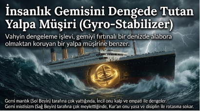Analoji: Vahyin bu dengeleme işlevi, bir geminin yalpa müşirine (gyro stabilizer) benzer. Gemi mantık tarafına (Batı/Sol Beyin) çok fazla yattığında, vahiy ona ağırlık merkezini kalp ve empati (İncil) tarafına çekmesi gerektiğini söyler; gemi mistisizm ve duygusallık (Doğu/Sağ Beyin) tarafına fazla meylettiğinde ise vahiy ona zihin, yasa ve disiplin (Kur'an) ile rotasını düzeltmesini emreder. Böylece insanlık gemisi, fırtınalı bir denizde alabora olmadan ilerlemeye devam eder.