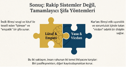 Duygu analizi verileri, teolojik bir gerçeği gün yüzüne çıkarmaktadır: İncil, bireyi sevgi ve lütuf ile teselli eden ağırlıklı olarak "iyimser" ve "empatik" bir tona sahipken; Kur'an, bireyi etik bir uyanıklık ve sorumluluk bilinci içinde tutan "vicdan" ve "takva" ölçütlerinde istatistiksel olarak baskındır. Bu iki yaklaşım, birbirini dışlayan rakip sistemler değil, insan ruhunun iki temel ihtiyacını karşılayan tamamlayıcı şifa yöntemleridir. Kur'an'daki müjde ve uyarı dengesi, İncil'in merhamet odaklı diliyle birleşerek insanlığı hem korkuyla pasifleşmekten hem de aşırı güvenle kayıtsızlaşmaktan korumaktadır.
