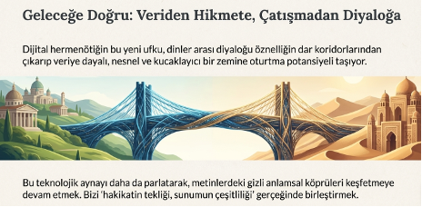"Nöropsikolojik bir denge projesi" olarak vahiy, Batı'nın rasyonalizmini İncil'in kalbiyle, Doğu'nun mistisizmini ise Kur'an'ın aklıyla ve yasasıyla dengeleyen büyük bir gyro-stabilizer (yalpa müşiri) görevi görmektedir. Yapay zekâ analizleri, bizlere metinlerin sadece "ne dediğini" değil, insan zihninin kıvrımlarında "nasıl yankılandığını" gösterme gücüne sahiptir. Dijital hermenötiğin bu yeni ufku, dinler arası diyaloğu öznelliğin dar koridorlarından çıkarıp veriye dayalı, nesnel ve kucaklayıcı bir zemine oturtma potansiyeli taşımaktadır.