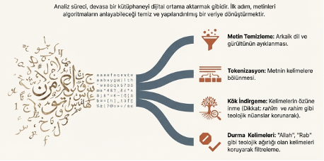 Hesaplamalı dilbilimsel analizin başarısı, büyük ölçüde ham metnin algoritmalar tarafından işlenebilir hale getirildiği ön işleme (pre-processing) aşamasına bağlıdır. Kutsal metinler; arkaik kelime dağarcığı, karmaşık sözdizimi, diyakritik (hareke) işaretleri ve yoğun metaforik anlatımlar içerdikleri için standart metin temizleme prosedürlerinden çok daha fazlasını gerektirir. (Goel & Arsiwala, 2024)