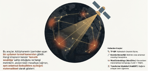 Analoji: Bu metodolojik çerçeveyi oluşturmak, binlerce yıllık devasa bir antik kütüphaneyi dijital bir ortama aktarmaya benzer. Ön işleme, tozlu ve silinmiş sayfaların (arkaik dil ve karmaşık yapı) restore edilip okunabilir hale getirilmesidir. Hesaplamalı araçlar ve vektör uzayları ise, kütüphanenin üzerinden uçan bir uydunun termal kameraları gibidir; her bir kitabın (sure veya bab) hangi konular etrafında "sıcaklık" (tematik yoğunluk) oluşturduğunu ve hangi kitapların raflar arası mesafeye bakılmaksızın aslında aynı gizli odalara (anlamsal özdeşliklere) açıldığını matematiksel olarak bize gösterir.