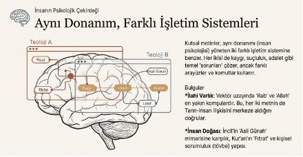 Analoji: Teolojik temelleri ve kavramsal haritaları incelemek, iki farklı işletim sistemiyle (teoloji) çalışan ancak aynı donanımı (insan psikolojisi) yönetmeye çalışan yazılımları analiz etmeye benzer. İstatistiksel veriler bize yazılımın kod yapısını (kelime frekanslarını) gösterirken; sosyal ve psikolojik perspektif, bu yazılımın kullanıcının (insanın) duygusal dünyasında ve sosyal yaşamında hangi "pencereleri" açtığını veya hangi "sorunları" (kaygı, suçluluk, adaletsizlik) nasıl çözdüğünü açıklar.