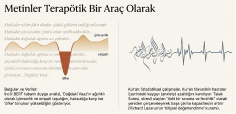 • Pratik Yansıması: İncil'deki "Dağdaki Vaaz" (Sermon on the Mount) üzerinde yapılan BERT tabanlı duygu analizleri, metnin ağırlıklı olarak iyimserlik ve empati taşıdığını, haksızlığa karşı ise "öfke" tonunun yükseldiğini göstermiştir. (Vora, Blau, Kachhwal, & Solo, 2024) Kur'an tilavetinin tıbbi personel ve ameliyat bekleyen hastalar üzerinde kaygıyı (anxiety) azalttığı ve ruhsal dinginlik sağladığı istatistiksel olarak kanıtlanmıştır. Richard Lazarus'un "bilişsel değerlendirme" kuramı çerçevesinde, Kur'an (örneğin boşanma konulu Talak Suresi'nde) stresli olayları birer yıkım olarak değil, "ilahi bir sınama ve sonrasında gelecek ferahlık" olarak yeniden tanımlayarak bireyin başa çıkma (coping) kapasitesini artırır. (Sayoud, A Visual Analytics based Investigation on the Authorship of the Holy Quran, 2015)