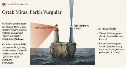 Analoji: Metinler arası kesişimleri incelemek, farklı zamanlarda ve farklı dillerde yazılmış iki deniz fenerinin ışık frekanslarını analiz etmeye benzer. NER ve matematiksel kesişimler fenerlerin üzerine inşa edildiği kayalıkların (ortak tarihsel miras) aynı olduğunu kanıtlar; peygamberlik modelleri ve karakter işlevleri ise ışığın ne tarafa (toplumsal düzene mi yoksa bireysel ruh haline mi) daha güçlü yansıdığını gösterir.