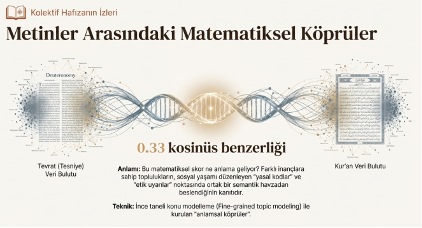 7.2. Vektör Uzayı Konumları: Semantik Havzanın Matematiksel Mesafesi Metinler arasındaki anlamsal mesafeyi ölçmek için ayetler, çok boyutlu bir uzayda matematiksel vektörler olarak temsil edilir. Yapılan çalışmalar; İncil ve Kur'an arasındaki Kosinüs benzerliği skorunun 0.33 olduğunu saptayarak, bu metinlerin "Orta Doğu semantik havzasından" beslenen, orta derecede benzer yapılar olduğunu ortaya koymuştur. Bu vektörel yaklaşım, kelime eşleşmesinin ötesine geçerek metinlerin derin anlamsal katmanlarındaki hizalanmaları keşfetmeye olanak tanır.